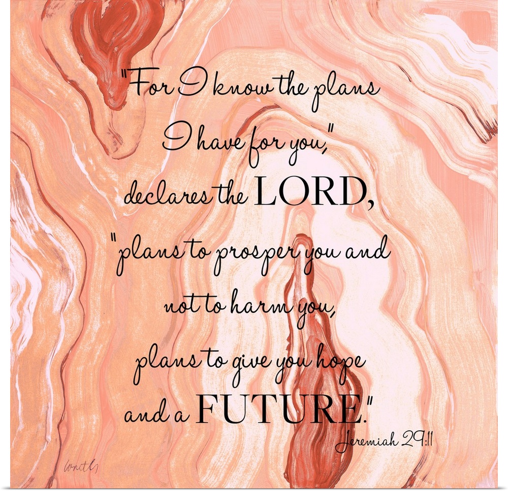 <p>Square abstract painting of agate in shades of orange and white with the bible verse "For I know the plans I have for you," declares the Lord, "plans to prosper you and not to harm you, plans to give you hope and a future" Jeremiah 28:11 written on top in black.</p>