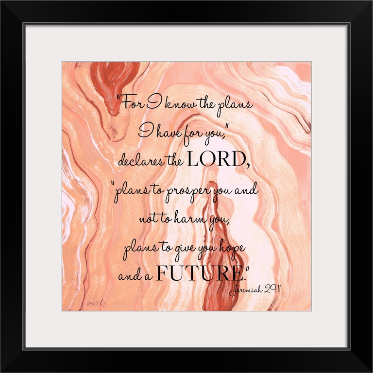 <p>Square abstract painting of agate in shades of orange and white with the bible verse "For I know the plans I have for you," declares the Lord, "plans to prosper you and not to harm you, plans to give you hope and a future" Jeremiah 28:11 written on top in black.</p>