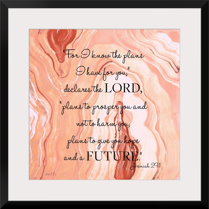 <p>Square abstract painting of agate in shades of orange and white with the bible verse "For I know the plans I have for you," declares the Lord, "plans to prosper you and not to harm you, plans to give you hope and a future" Jeremiah 28:11 written on top in black.</p>