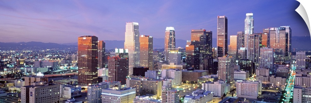<p>This large panoramic piece shows many of the skyscrapers in downtown Los Angeles during dusk.</p>