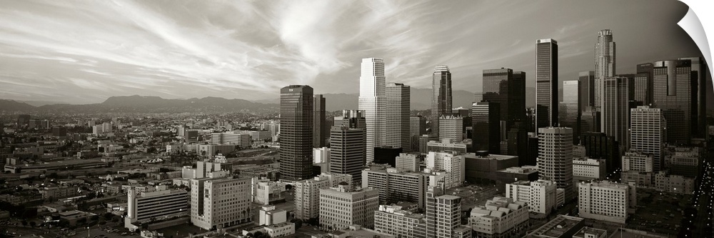 <p>Panoramic photograph of Los Angeles, CA skyline with mountains in the distance and clouds overhead.</p>