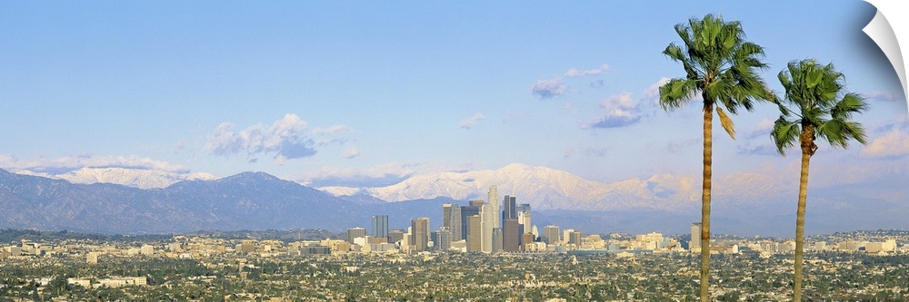 <p>A wide angle photograph taken from an aerial view of Los Angeles with two large palm trees on the right of the picture and mountains shown in the background.</p>
