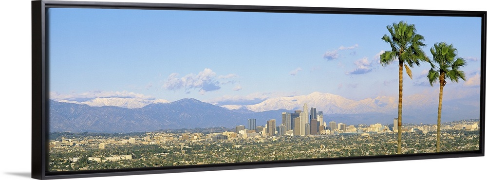 <p>A wide angle photograph taken from an aerial view of Los Angeles with two large palm trees on the right of the picture and mountains shown in the background.</p>