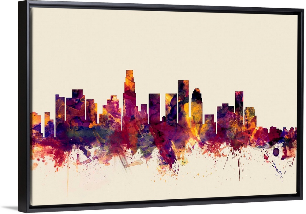 <p>Watercolor artwork of the Los Angeles skyline against a beige background.</p>