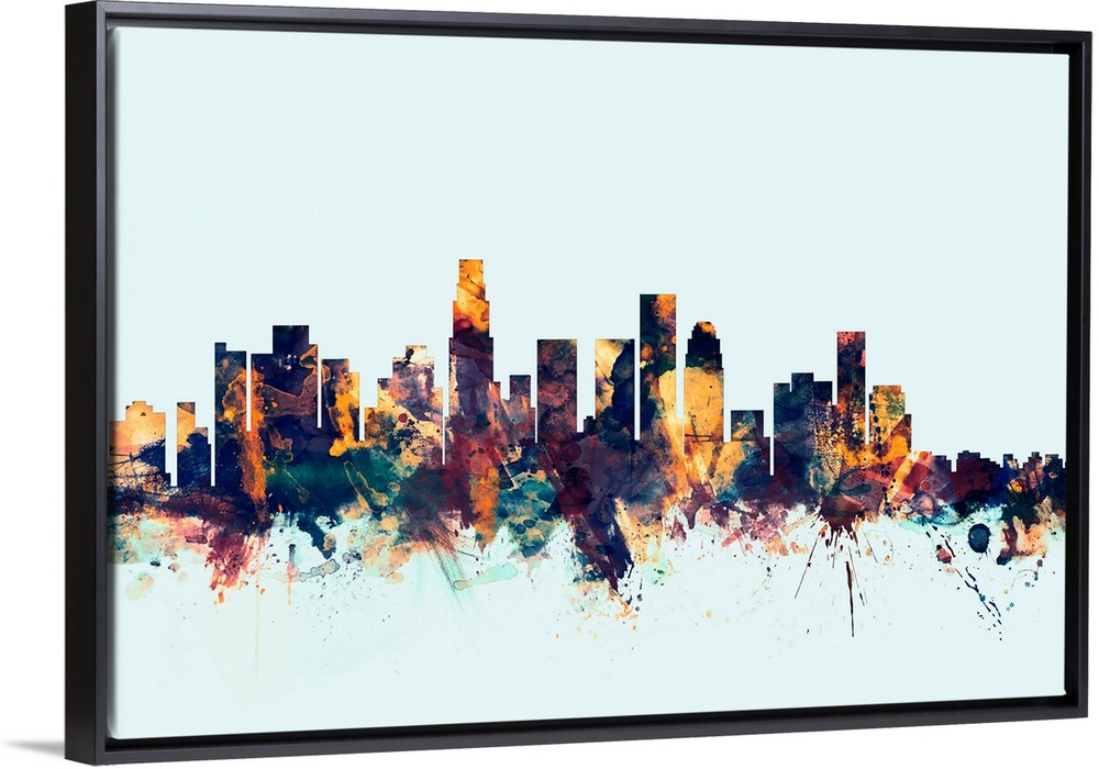 <p>Dark watercolor silhouette of the Los Angeles city skyline against a light blue background.</p>