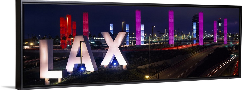 <p>Large panoramic photograph of the Los Angeles International Airport with large LAX letters by a highway.</p>