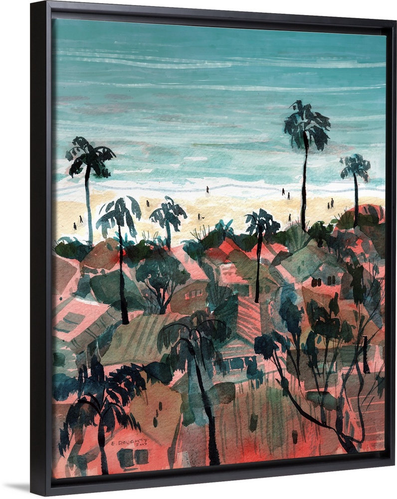 <p>View from Asilomar View Park by the ritzy Pacific Palisades neighborhood in Los Angeles, looking down at the cluster of houses bordering the beach. This artwork was originally painted in watercolor on location.</p>