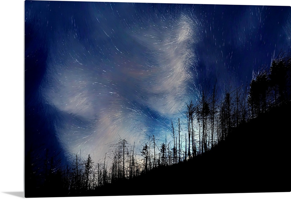 <p>Conceptual landscape image with silhouetted trees made with thin lines on a hill with a blue and white swirled sky.</p>