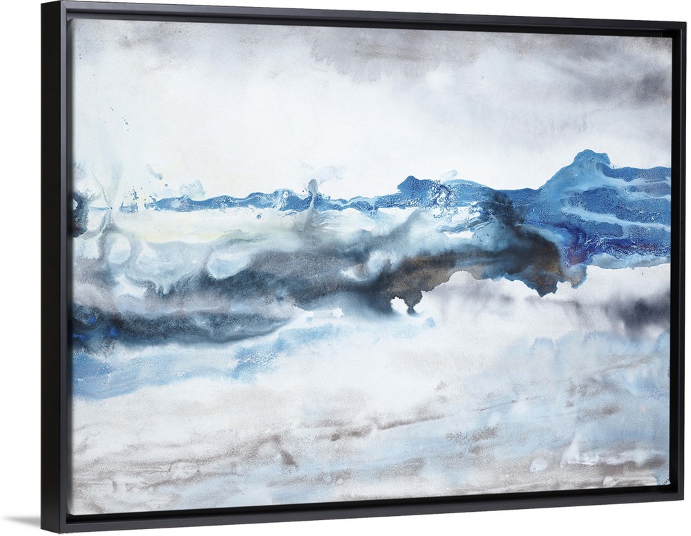 <p>Contemporary abstract painting in flowing blue and grey tones, resembling waves crashing against a rocky shore.</p>