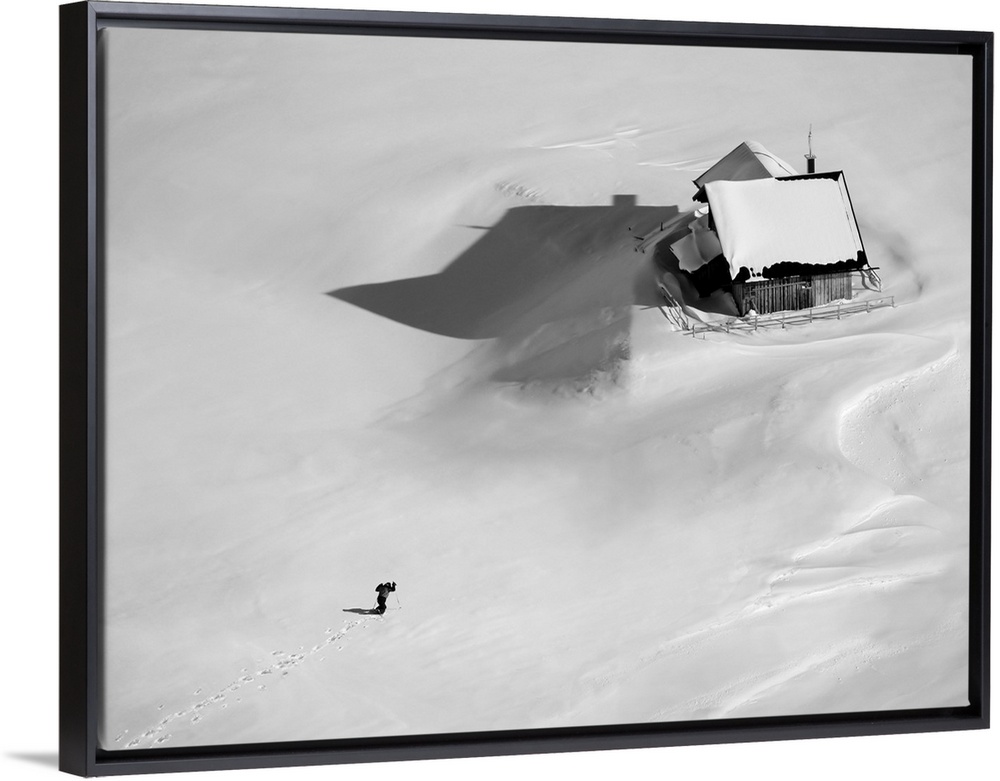 <p>Aerial view of a skier making his way back to his house in the middle of an empty landscape with thick snow.</p>