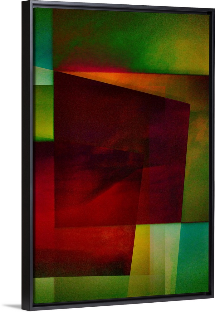 <p>Geometric abstract artwork that consists of deep reds and shades of green in polygonal shapes.</p>