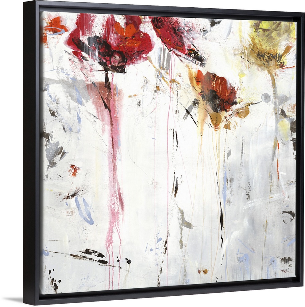 <p>Square abstract floral painting in shades of red, orange and white.</p>