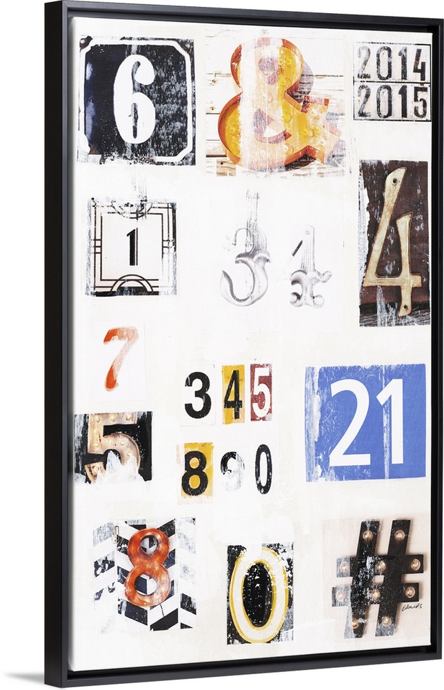 <p>Contemporary art with uniquely designed numbers and signs with a vintage feel on a white background.</p>
