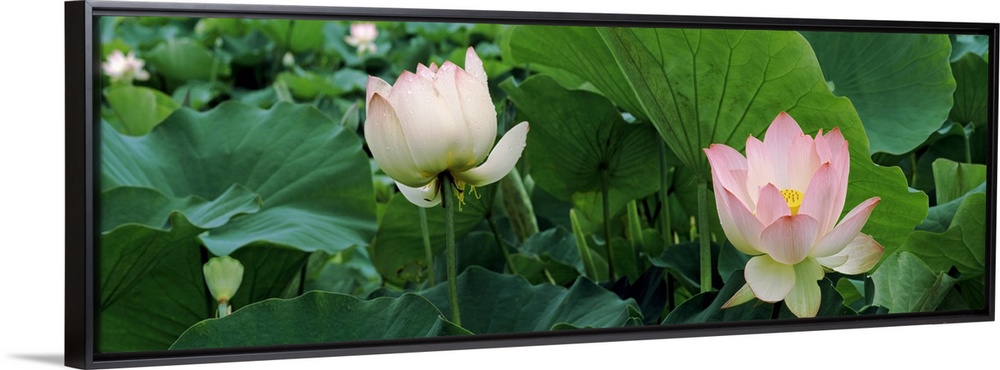 <p>Close up photo of two pink lotus flowers sticking up among green lotus leaves on a pond.</p>