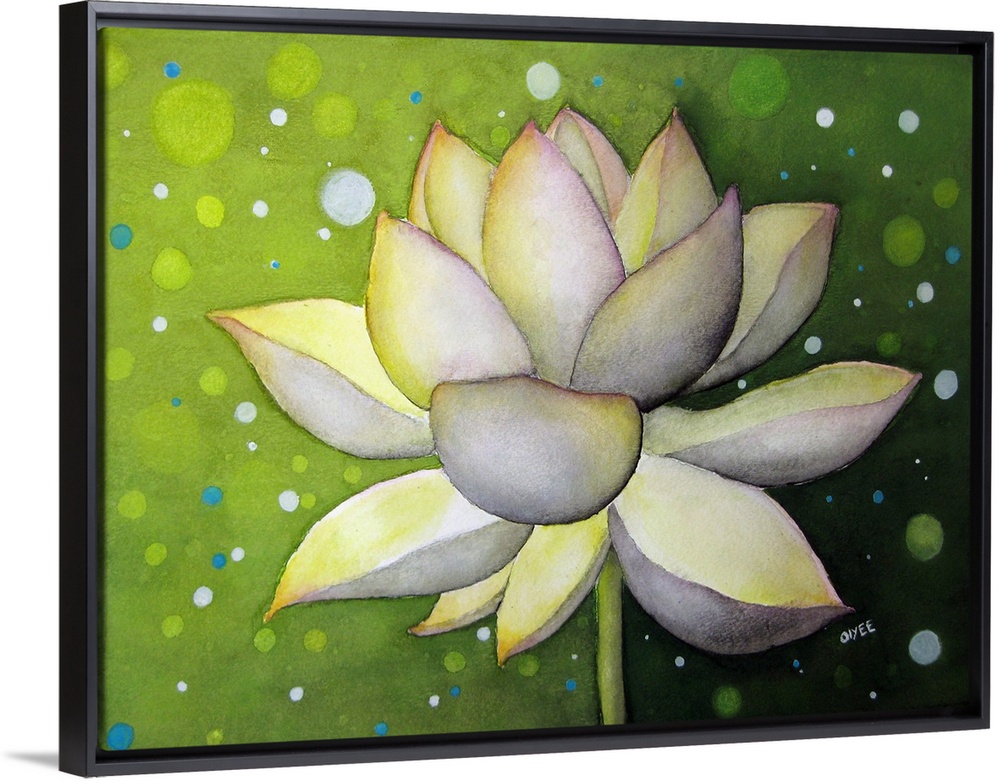 <p>Painting of a white lotus flower on a green background with blue, white, and light green dots.</p>