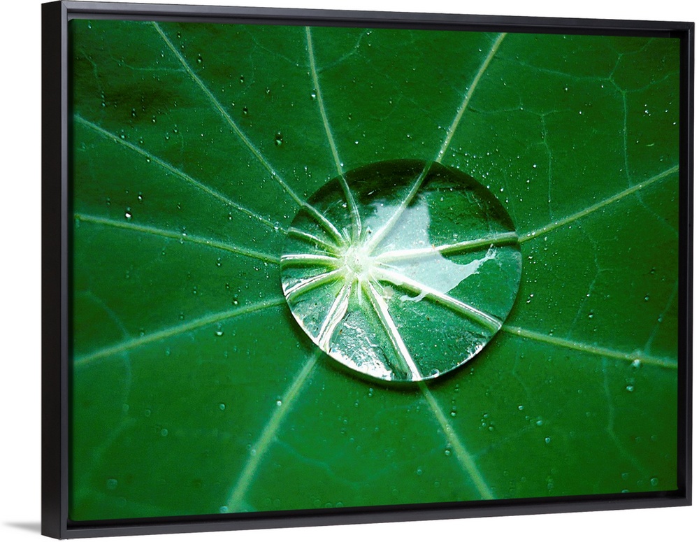 <p>Close-up of a raindrop in the center of a nasturtium leaf, exhibiting the lotus effect, thereby also magnifiying the veins of the leaf.</p>