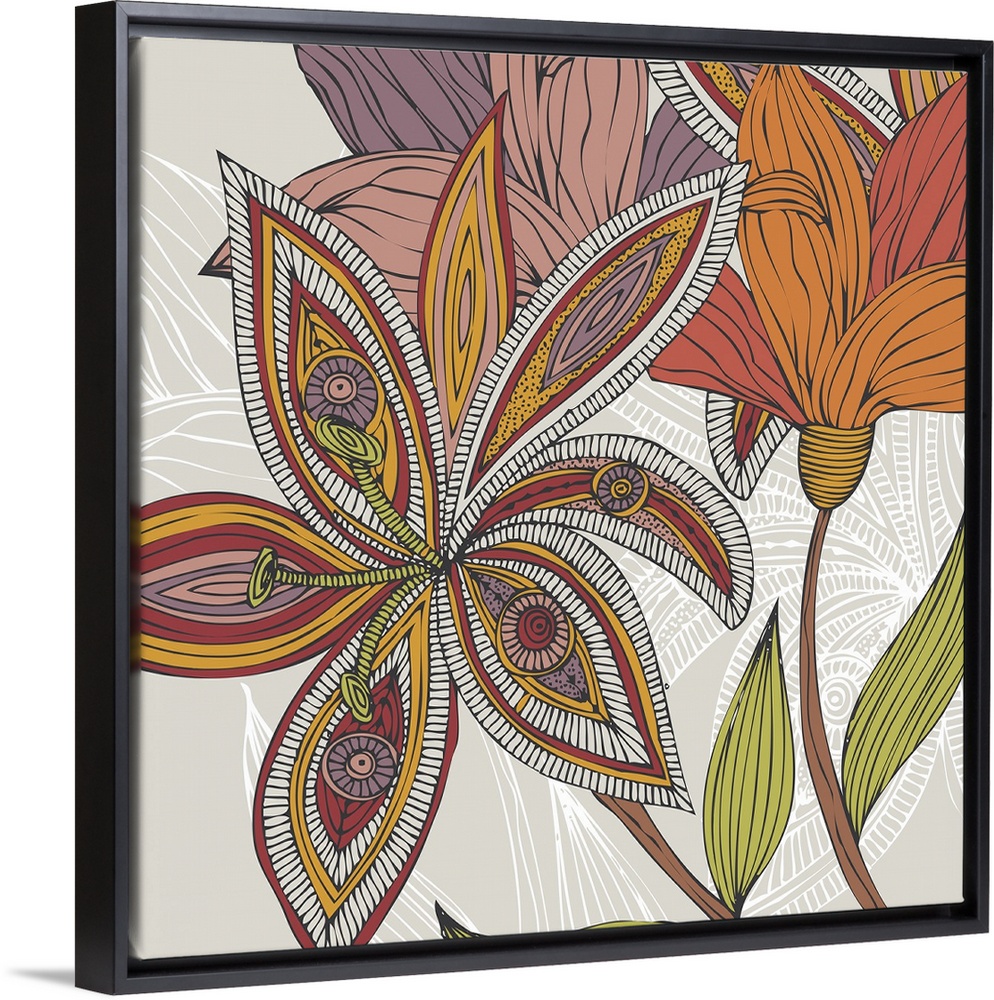 <p>Square abstract painting on canvas of brightly colored flowers outlined in black.</p>