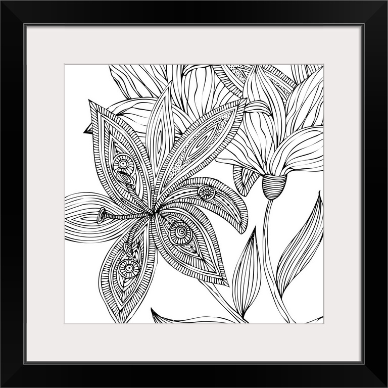 <p>Contemporary line art of a big intricately designed flower with other flowers against a white background.</p>