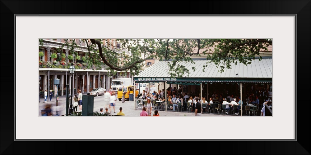 <p>Large panoramic photograph of the French quarter in New Orleans with a tree hovering over and an outdoor restaurant filled with people just across the street.</p>
