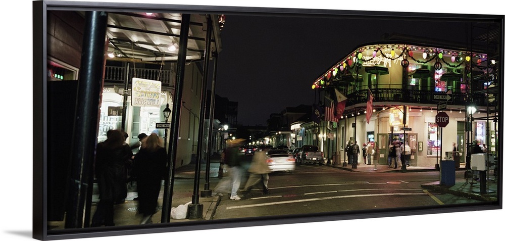 <p>Picture taken of a street in New Orleans with buildings lit up and people walking along the sides.</p>