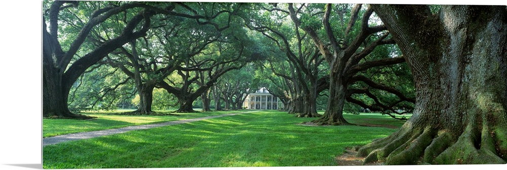 <p>Panoramic photograph of driveway lined with huge trees leading to an old home.</p>