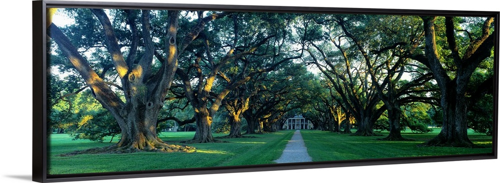 <p>Panoramic photograph of a large estate in New Orleans, Louisianna (LA) surrounded by thick oak trees and a gravel driveway.</p>
