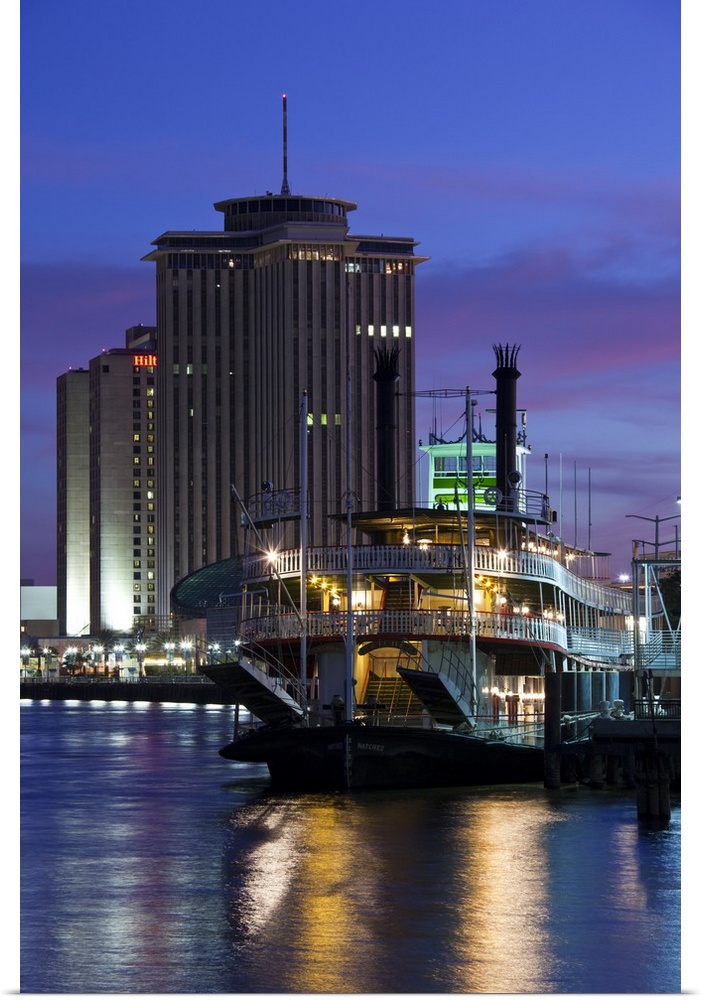 <p>USA, Louisiana, New Orleans. World Trade Center, riverboat and Mississippi Riverfront, dusk.</p>