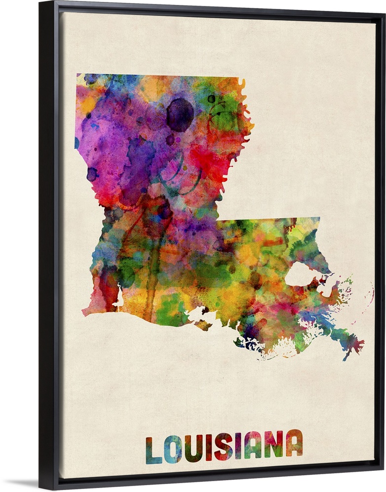 <p>Contemporary piece of artwork of a map of Louisiana made up of watercolor splashes.</p>