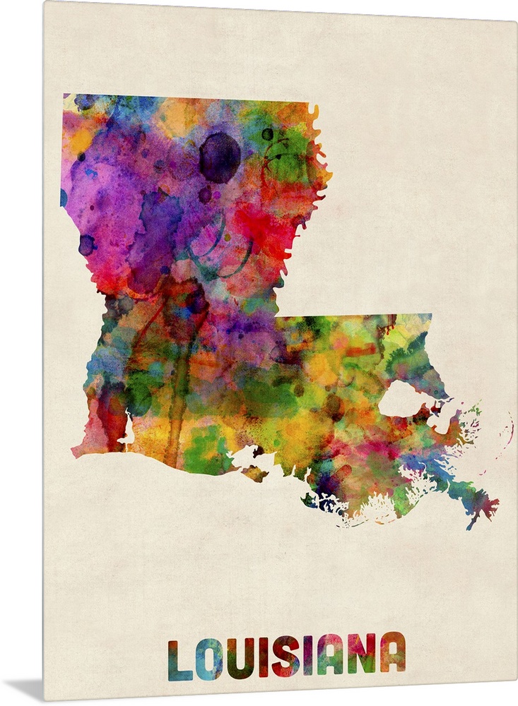 <p>Contemporary piece of artwork of a map of Louisiana made up of watercolor splashes.</p>