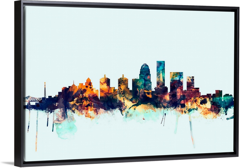 <p>Dark watercolor silhouette of the Louisville city skyline against a light blue background.</p>