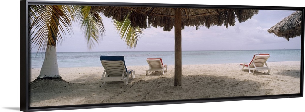<p>Huge, wide angle photograph of several lounge chairs beneath umbrellas and a palm tree, on 7-Mile Beach in Negril, Jamaica.</p>
