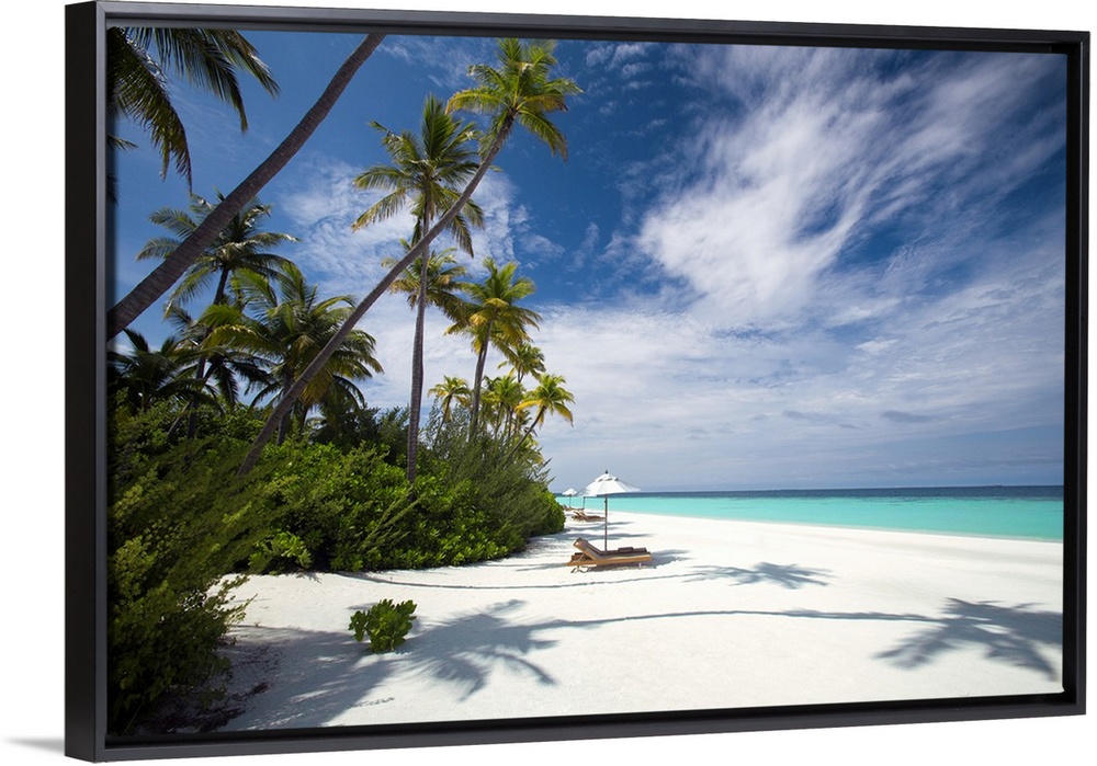 <p>Lounge chairs under shade of umbrella on tropical beach, Maldives, Indian Ocean</p>