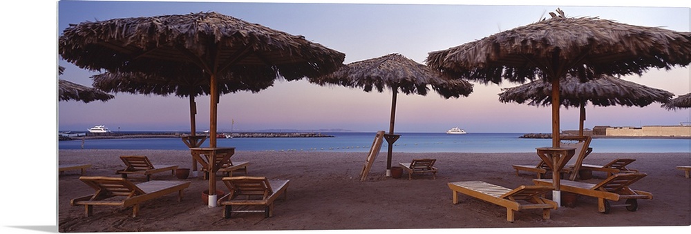 <p>Lounge chairs with sunshades on the beach, Hilton Resort, Hurghada, Egypt</p>
