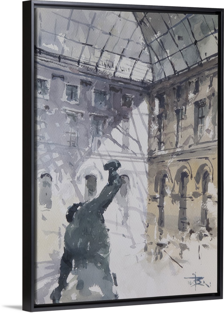 <p>Soft watercolor brush strokes in subdued colors create an interior view from inside the Louvre Museum.</p>