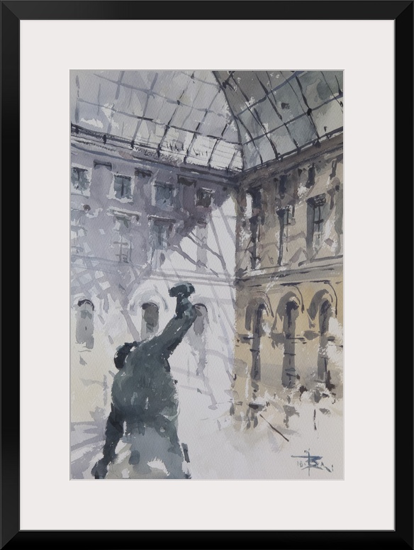 <p>Soft watercolor brush strokes in subdued colors create an interior view from inside the Louvre Museum.</p>