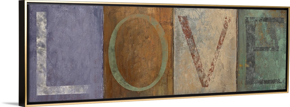 <p>Typographic panoramic painting of the word "LOVE." Each letter is within a different colored square. The letters are distressed and eroded.</p>