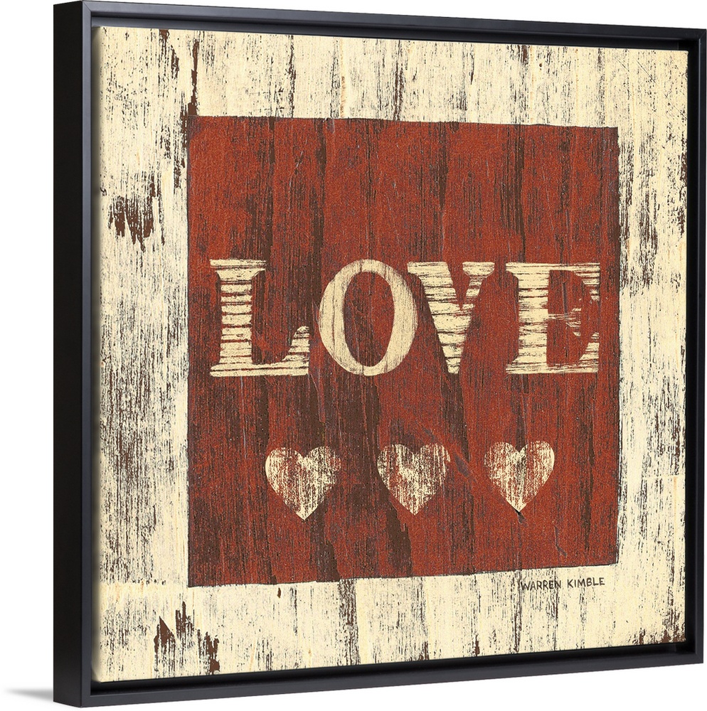<p>Inspirational artwork of the word ""LOVE"" with three hearts underneath in a red square painted over a wood panel texture.</p>