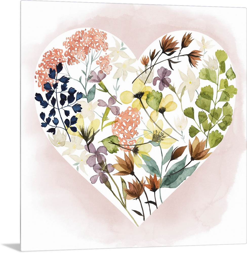 <p>Watercolor illustration of a heart filled with botanical elements including leaves and flowers.</p>