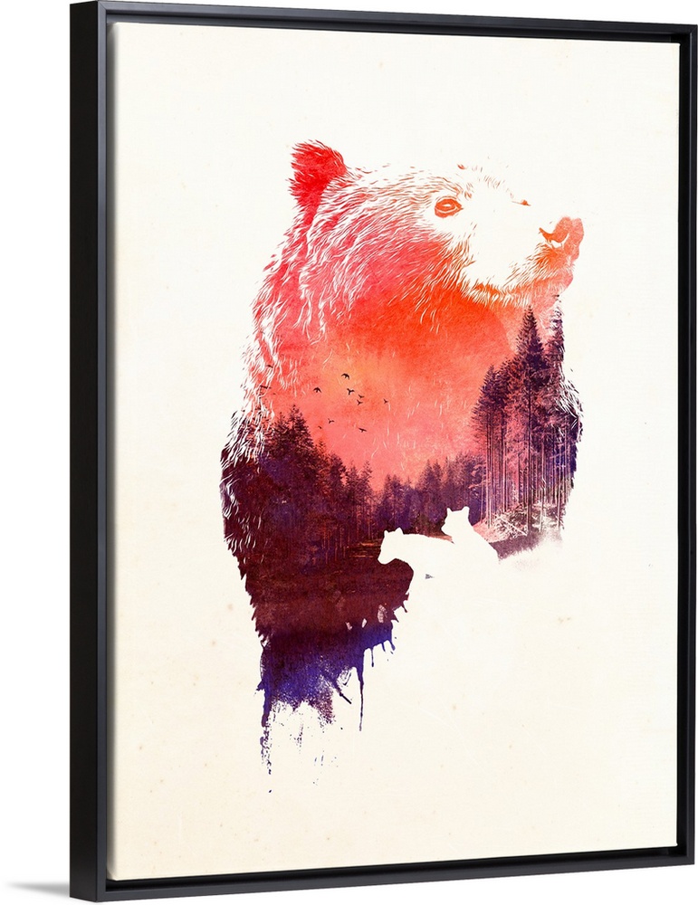 <p>Pop art of a bear with a serene forest scene in its fur.</p>