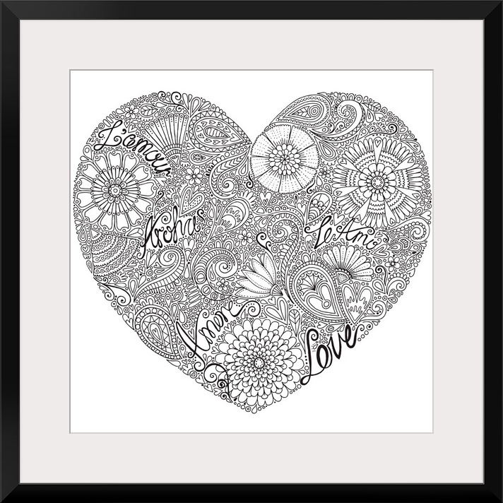<p>Black and white line art made out of flowers creating a heart shape with the word "love" written inside in different languages.</p>