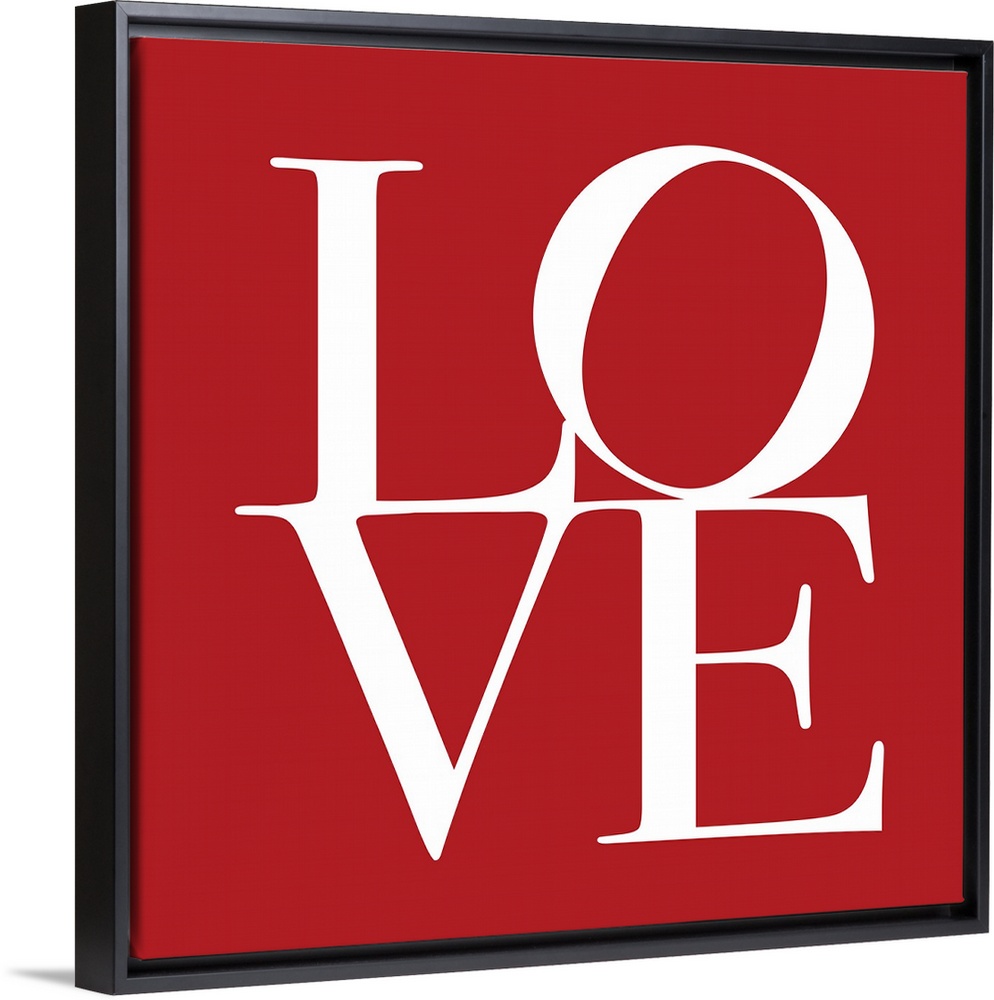 <p>Square art on a large canvas of the word "LOVE" with a tilted "O", written against a solid red background.</p>