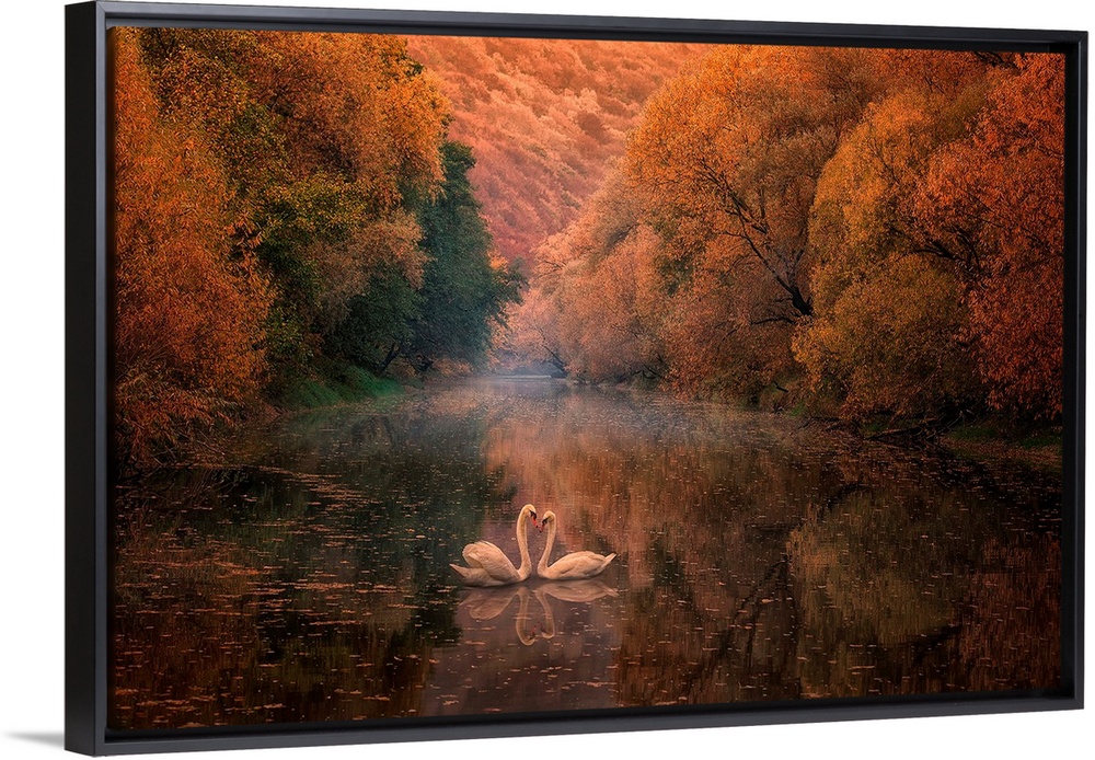 <p>Two swans meet face to face in a lake in an autumn forest.</p>
