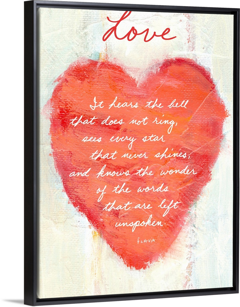 <p>Vertical, large painting of a heart on a light background, painted with thick texture and rough edges. The word "Love" is in script above the heart, while inside of the heart is the text "It hears the bell that does not ring, sees every star that never shines, and knows the wonder of the words that are left unspoken".</p>