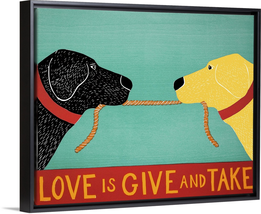 <p>Illustration of a black and yellow lab playing tug-a-war with a rope and the phrase "Love is Give and Take" written at the bottom.</p>