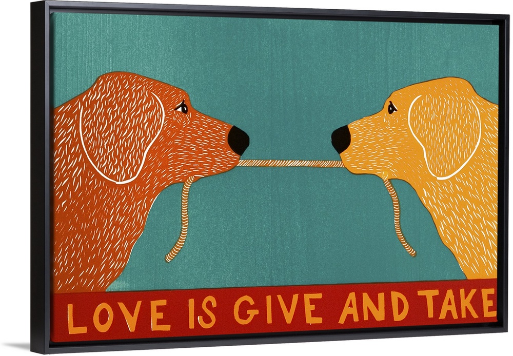 <p>Illustration of a golden retriever and a yellow lab playing tug-a-war with a rope and the phrase "Love is Give and Take" written at the bottom.</p>