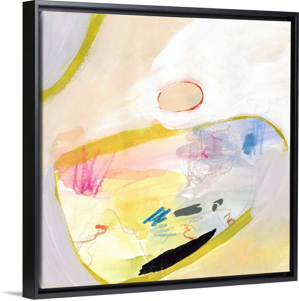 <p>Contemporary abstract painting in various colors with large circular shapes in bright yellow.</p>
