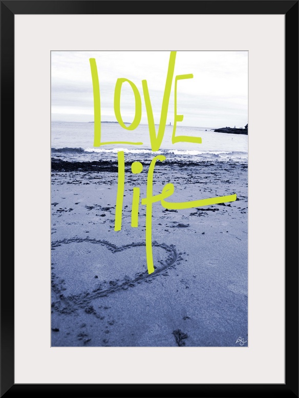 <p>"Love Life" handwritten over a photograph of a heart drawn in the sand on a beach.</p>
