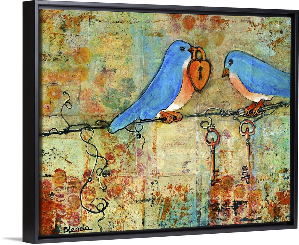 <p>Lighthearted contemporary painting of two bluebirds with one of them holding a love lock, against an abstract background.</p>