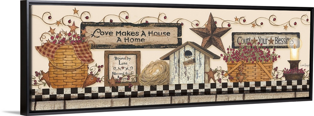 <p>Farmhouse still life of a dresser with rustic objects including a birdhouse, metal star, and baskets.</p>