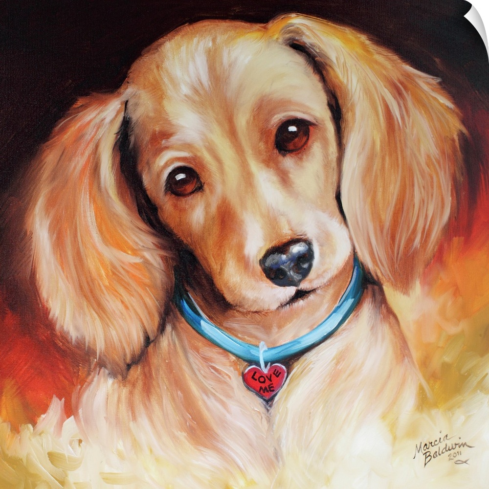 <p>Painting of a blonde dachshund wearing a heart shaped tag that says "Love Me" on a square background.</p>